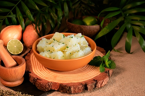 Gekochte Manioka, serviert mit einer Soße aus Knoblauch, Zitrone und Olivenöl.