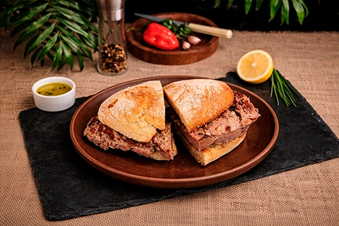 Saftiges Rindfleisch im Brot, frisch gegrillt und mit hausgemachter Knoblauch, Mayonnaise bestrichen. Ein kräftiger, heißer Biss mit echtem Geschmack.